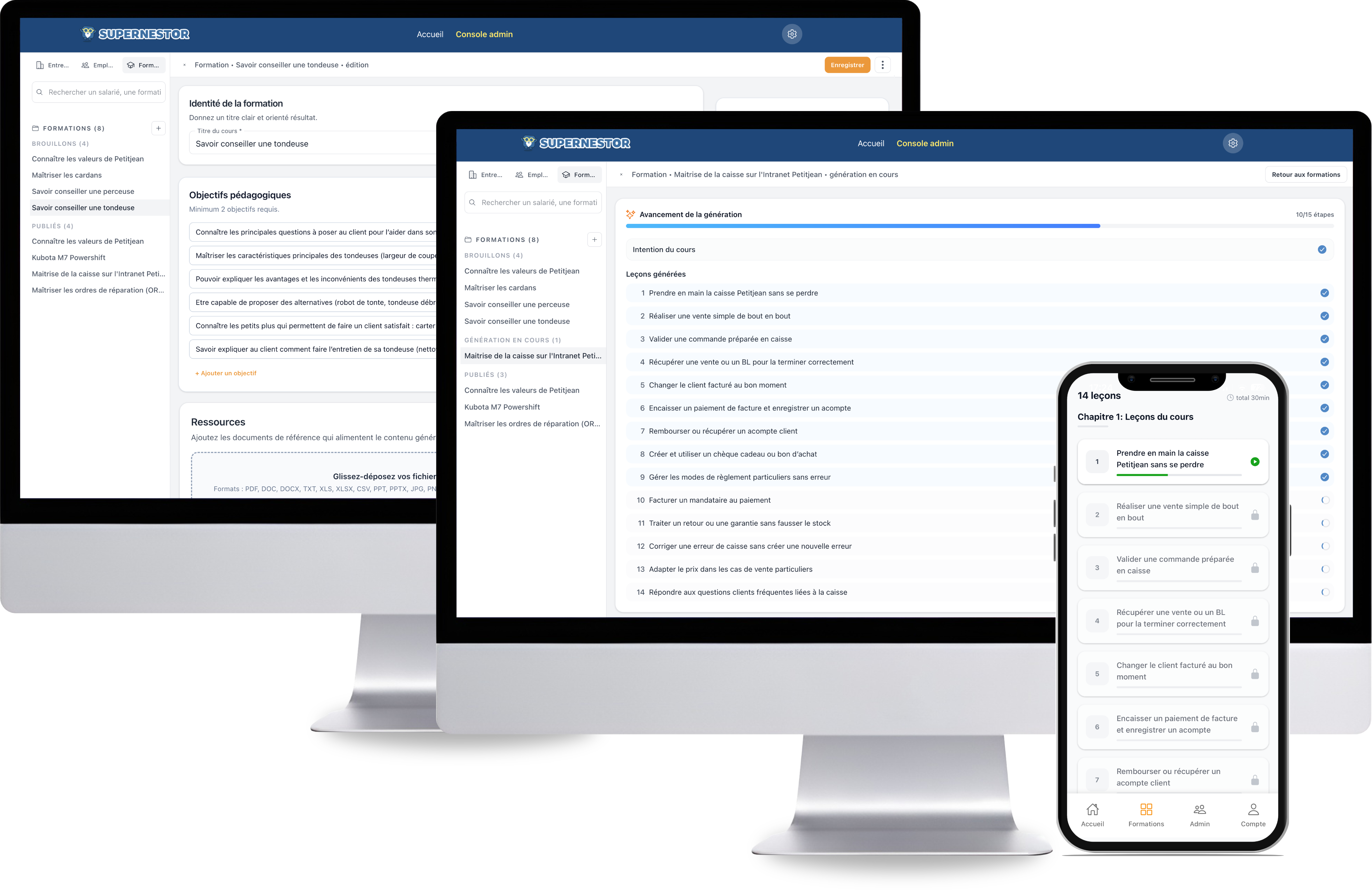 Nestor crée automatiquement vos contenus en un parcours de formation complet, découpé en leçons interactives prêtes à l'emploi.